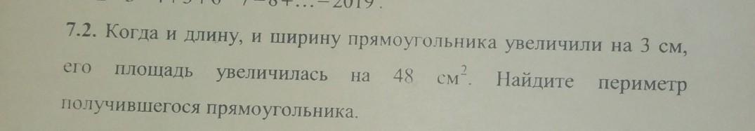 1) Пусть x см - длина данного прямоугольника; y см - его ширинатогдаxy см² - площадь данного прямоугольника.(x+3) см - длина нового прямоугольника; (y+3) см - его ширинатогда(x+3)(y+3) см² - площадь нового прямоугольника.По условию площадь увеличилась на 48см², получаем уравнение:(x+3)(y+3)=xy+48xy+3y+3x+9=xy+48xy+3y+3x+9-xy=483x+3y+9=483x+3y=48-93(x+y)=39x+y=39:3x+y=13 2) Периметр получившегося прямоугольника находим так:((x+3)+(y+3))·2 == (x+3+y+3)·2 == (x+y+6) · 2 == (x+y) · 2+6 ·2 == (x+y) · 2+12Выше уже нашли сумму x+y=13, заменим скобку числом 13. (x+y) · 2+12 => 13·2+12=26+12=38