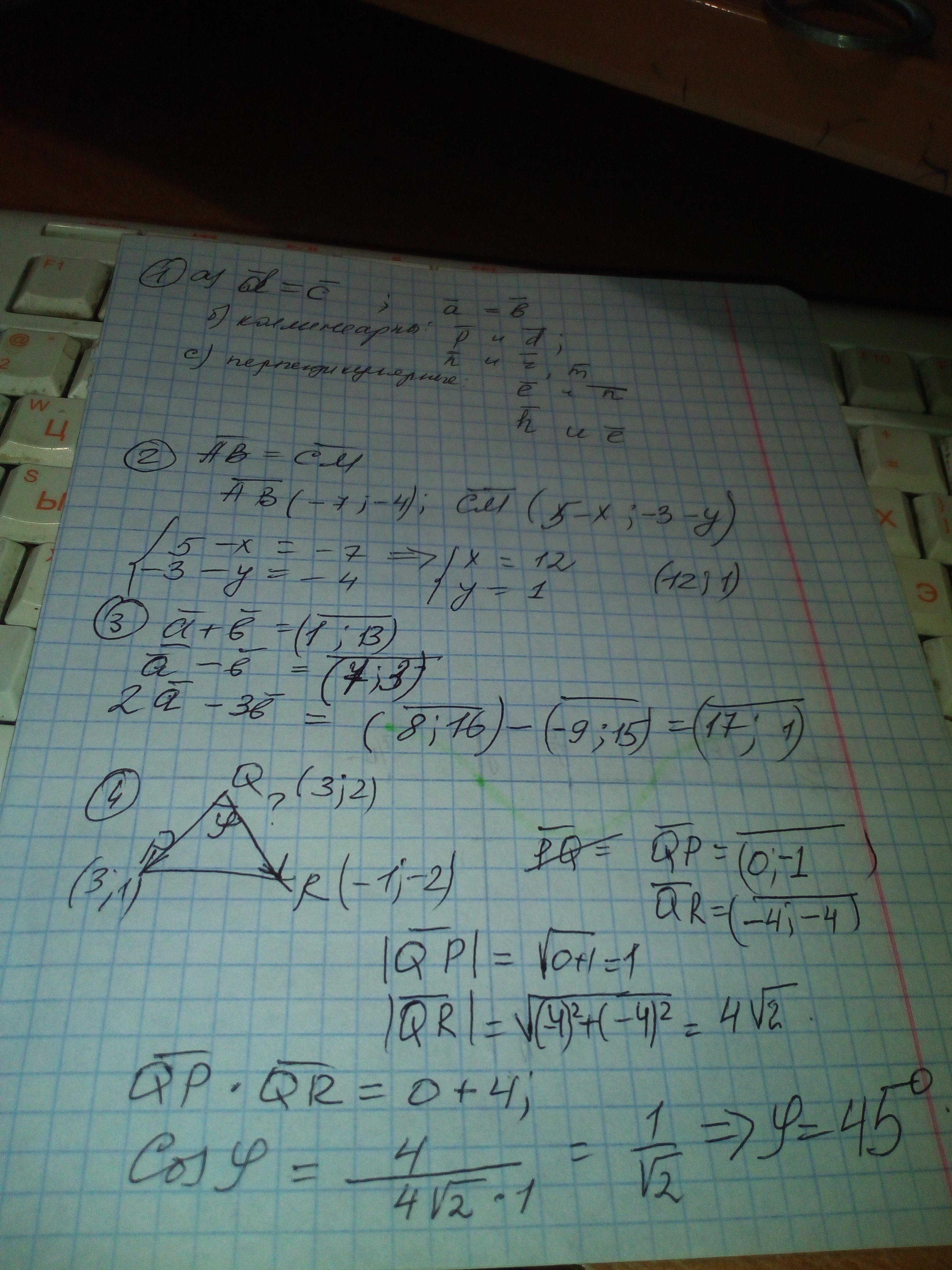 чтобы найти координаты вектора, надо от координат конца отнять координаты начала. А чтобы найти скалярное произведение. надо перемножить соответствующие координаты и результаты сложить. Чтобы найти модуль. или длину. вектора. надо извлечь корень квадратный из суммы квадратов его координат.