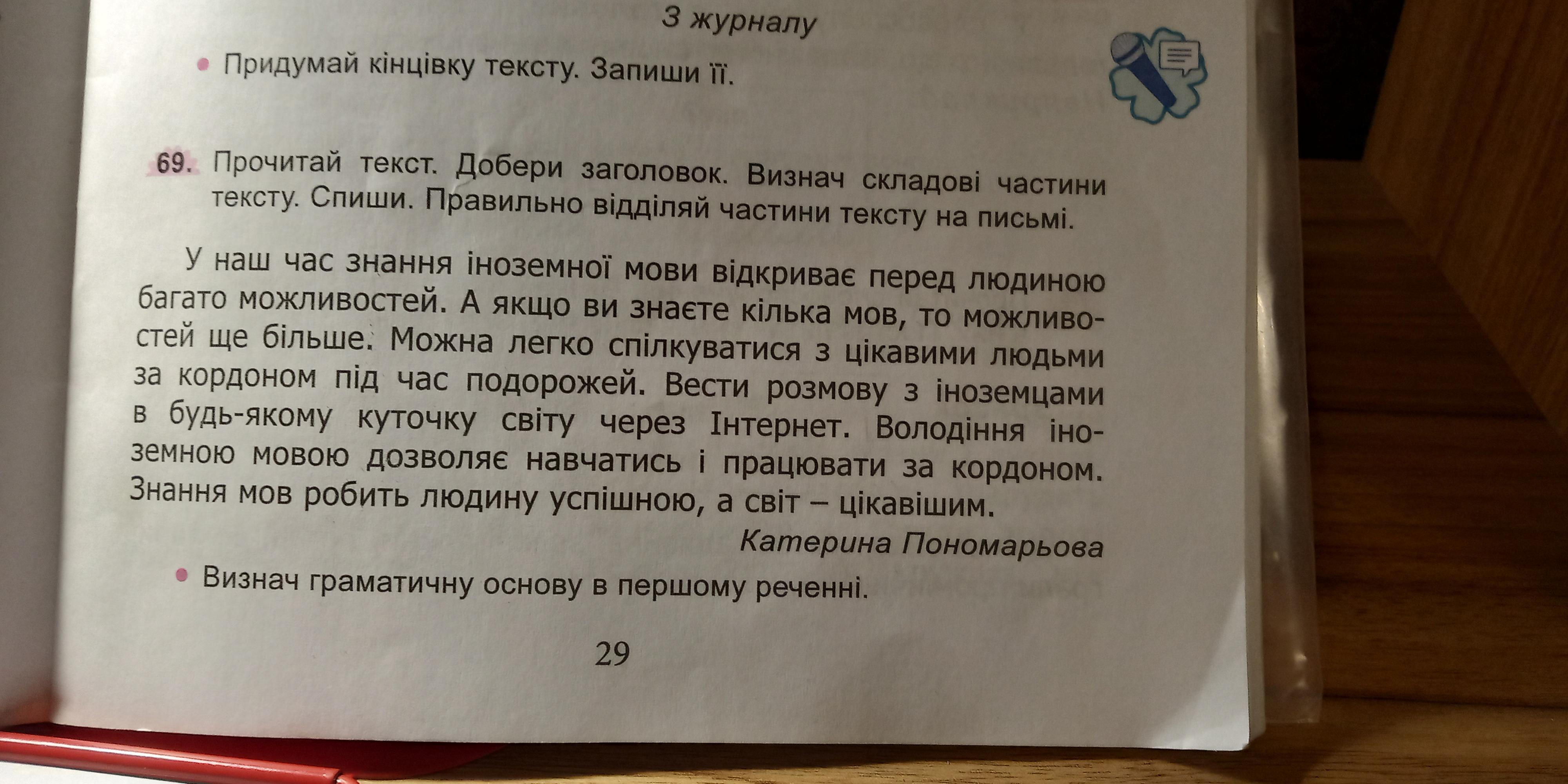 Заголовок=Потрібно знати іноземні мови Складові частини тексту=початок, основна частина, кінцівка.