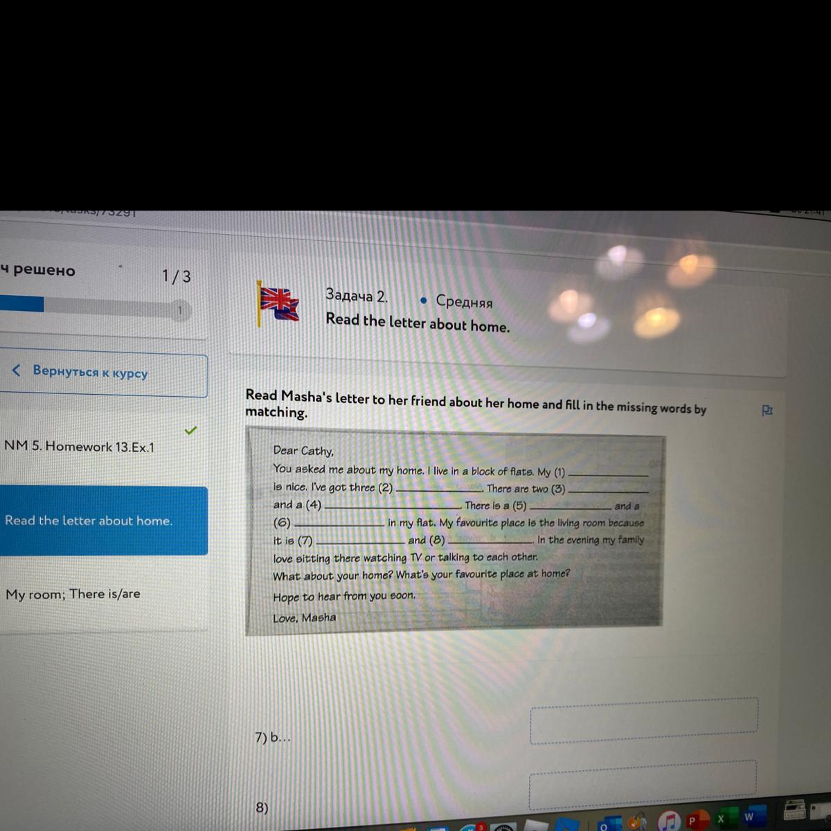 Ответ: 1)flat ; 2)rooms ; 3) beds ; 4) TV here ; 5) big window ; 6) ancient vases ; 7) modern ; 8) comfortable