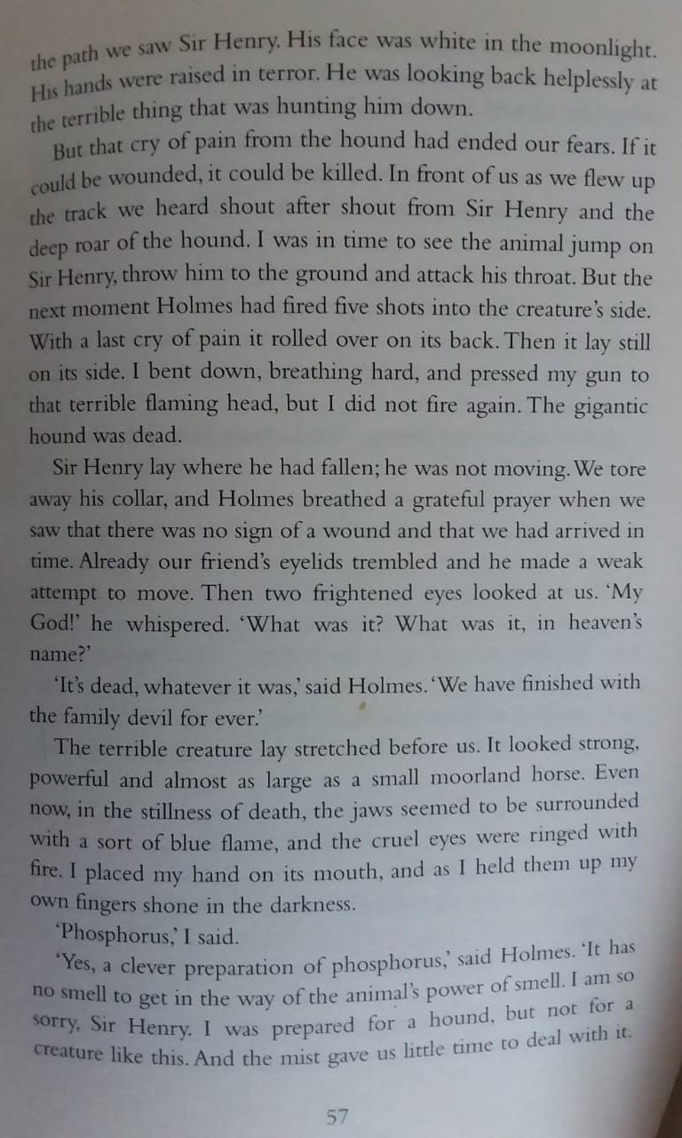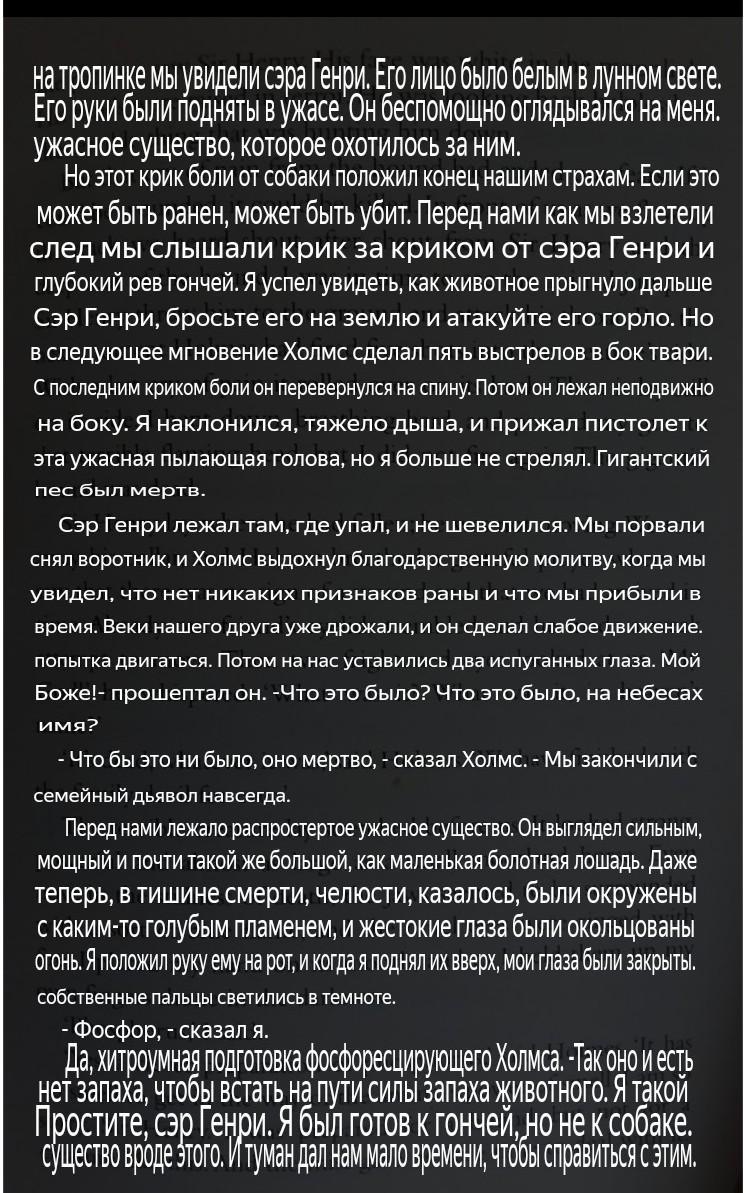 Его лицо было белым в лунном свете. Его руки были подняты в ужасе. Он беспомощно оглядывался назад на ужасную вещь, которая преследовала его. Но этот крик боли от собаки прекратил наши страхи. Если бы это могло быть ранено, это могло быть убито. Перед нами, когда мы летели вверх по дорожке, мы услышали крик за криком сэра Генри и глубокий рев собаки. Я успел увидеть, как животное запрыгнуло на сэра Генри, бросило его на землю и поразило его горло. Но в следующий момент Холмс сделал пять выстрелов в сторону существа. С последним криком боли он перевернулся на спину. Затем он по-прежнему лежал на боку. Я наклонился, тяжело дыша и прижал пистолет к этой ужасной пылающей голове, но я больше не стрелял. Гигантская собака была мертва. Сэр Генри лежал там, где упал; он не двигался. Мы оторвали его ошейник, и Холмс вздохнул с благодарной молитвой, когда мы увидели, что нет никаких признаков раны и что мы прибыли вовремя. Веки нашего друга уже дрожали, и он сделал слабую попытку пошевелиться. Затем два испуганных глаза посмотрели на нас. Боже мой!' он прошептал. 'Что это было? Что это было, во имя небес? Он мертв, что бы это ни было, - сказал Холмс. Мы покончили с семьей дьявола навсегда. Ужасное существо лежало перед нами. Он выглядел сильным, мощным и почти таким же большим, как маленькая вересковая лошадь. Даже сейчас, в тишине смерти, челюсти, казалось, были окружены каким-то синим пламенем, а жестокие глаза были окружены огнем. Я положил руку на его рот, и когда я поднял их, мои собственные пальцы светились в темноте. Фосфор, сказал я. Это умный препарат фосфора, - сказал Холмс. Он не имеет запаха, чтобы препятствовать силе обоняния животного. Мне очень жаль, сэр Генри. Я был подготовлен к гончей, но не к такому существу. И туман дал нам мало времени, чтобы справиться с этим.