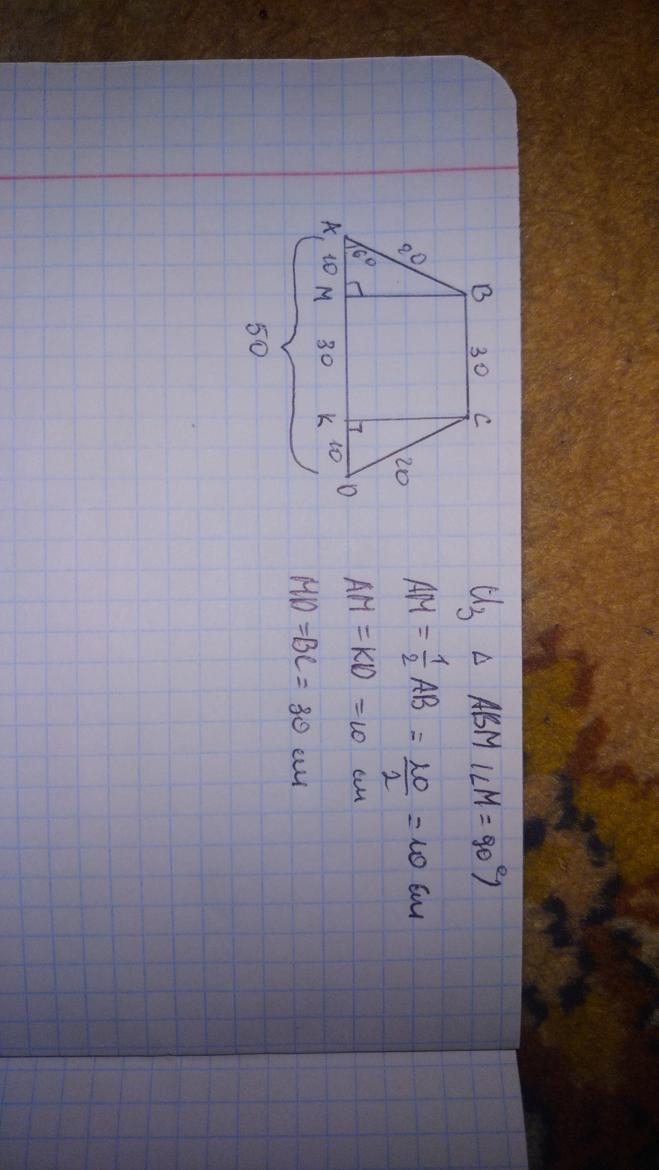 В равнобедренной трапеции АВСD острый угол А равен 60°. Боковая сторона равна 20см, а большее основание АD равно 50см. Найдите меньшее основание ВС