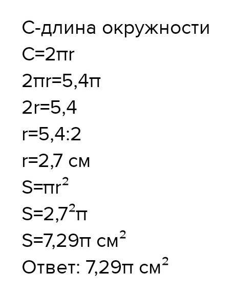 2) длина окружности 5,4п. найдите площадь круга которую ограничевает данная окружность