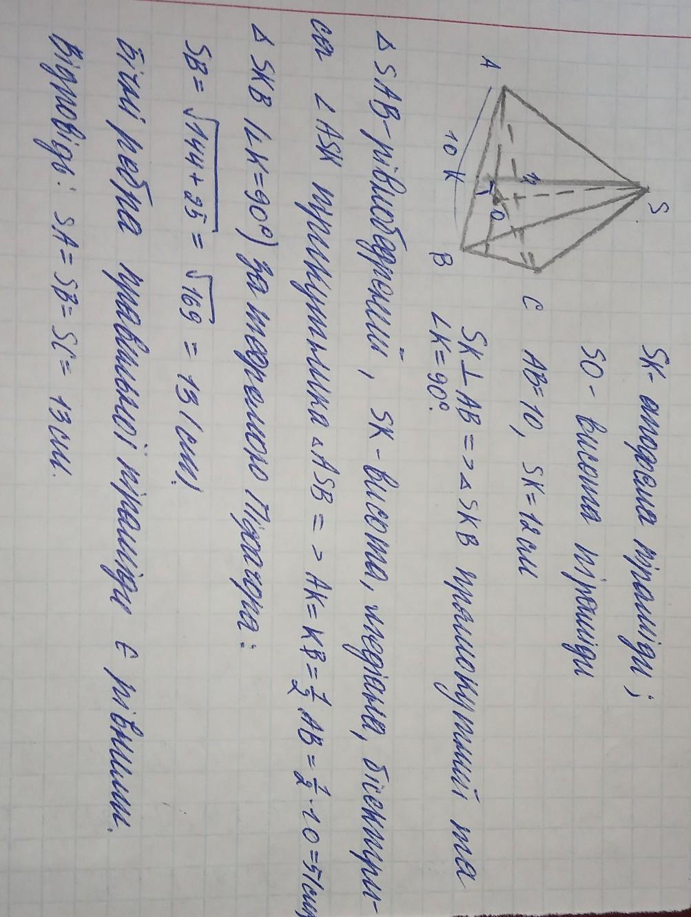 знайдіть бічне ребро правильної трикутної піраміди апофема якої дорівнює 12 см,а сторона основи 10 см