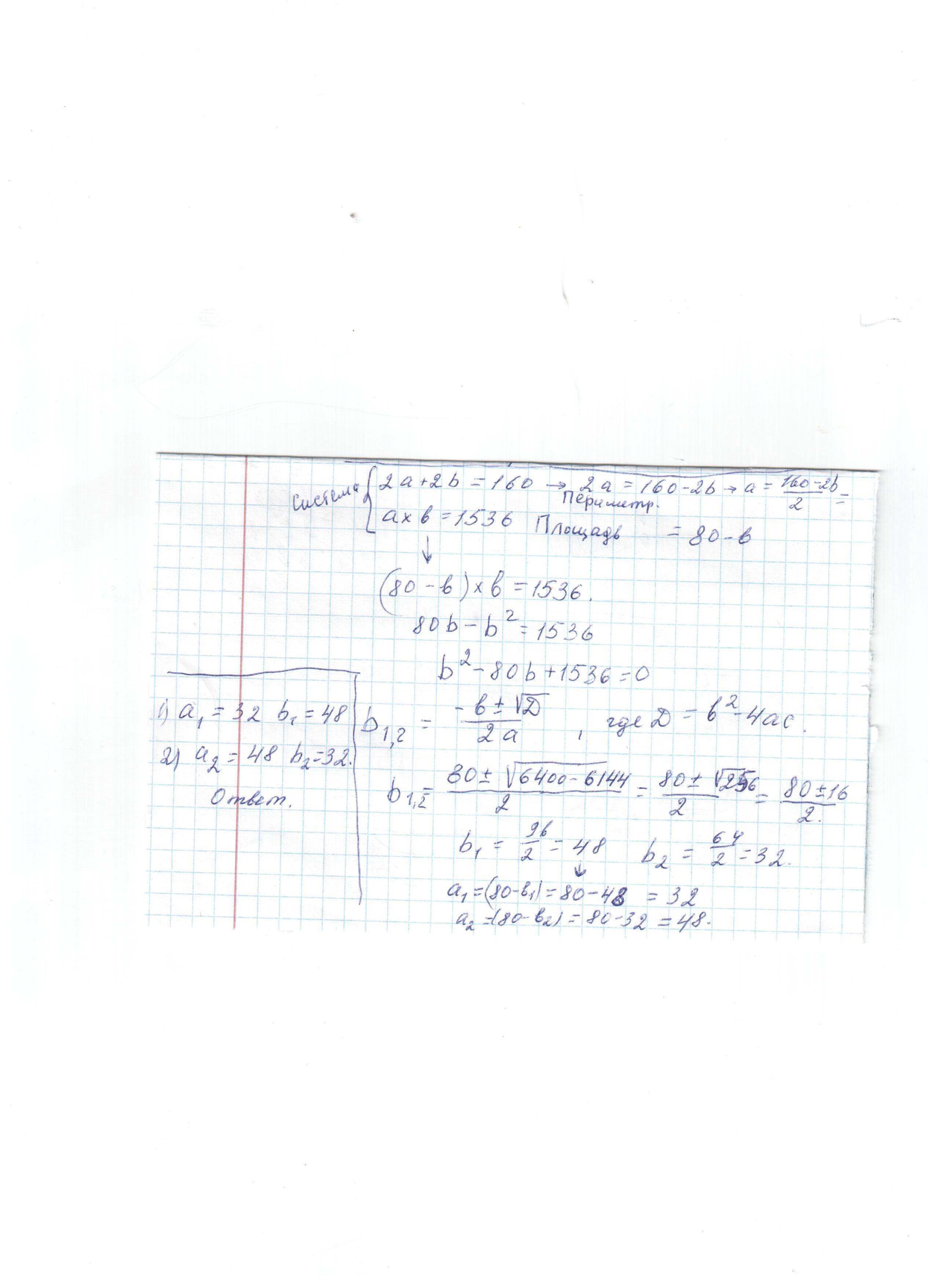 Площадь прямоугоного участка земли 1536м², а его периметр равен 160м. Найдите длины сторон.