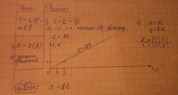 Поезд, двигаясь равномерно, прошел мимо светофора со скоростью 30 км/ч. Напишите уравнение движения поезда, приняв за начало отсчета светофор. Постройте график движения поезда.