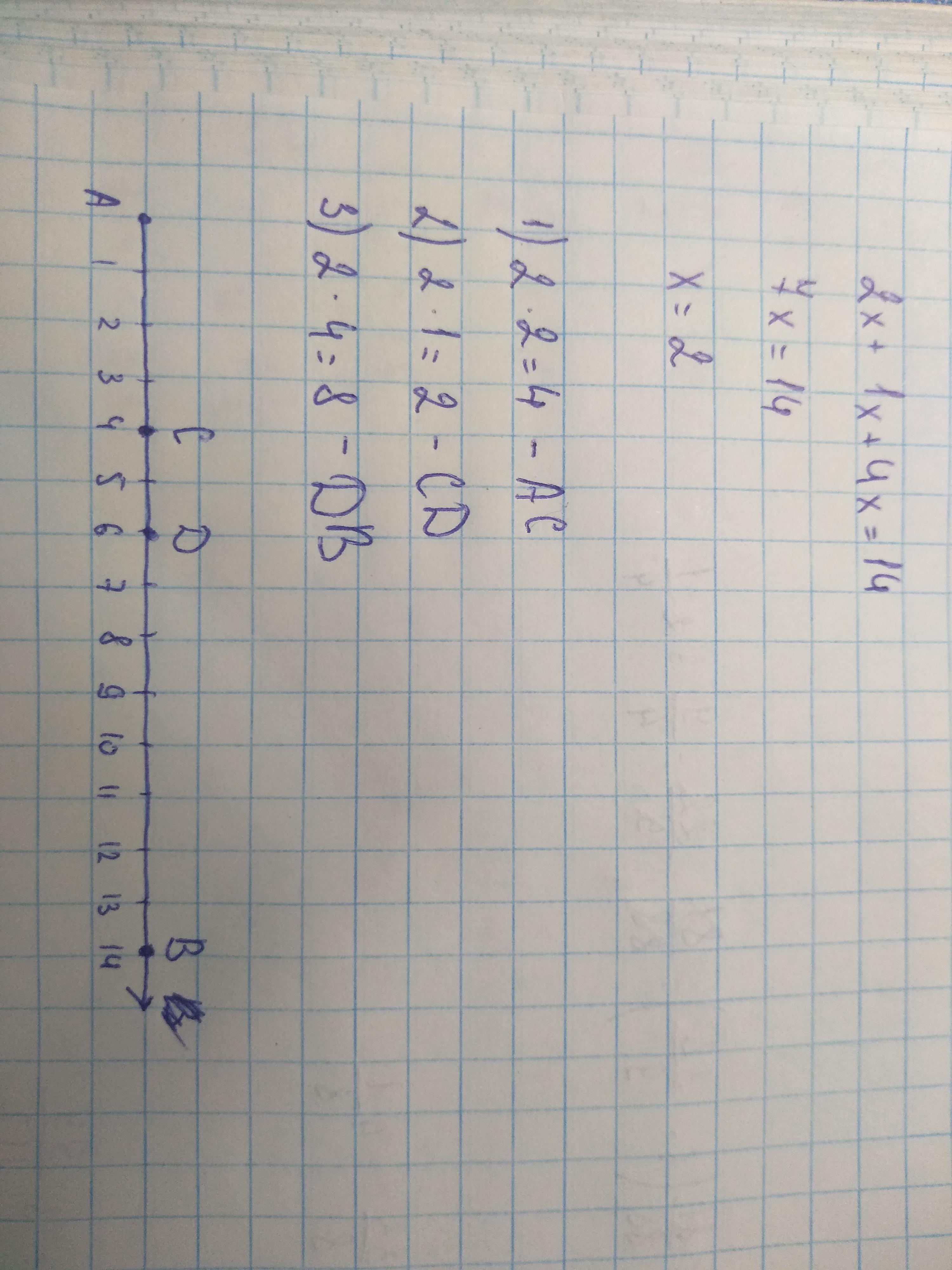 Отрезок АВ длиной 14 см разделён точками C и D на части АС, СD и DB, длины которых относятся, как 2:1:4. Найдите длины этих частей отрезка АВ.