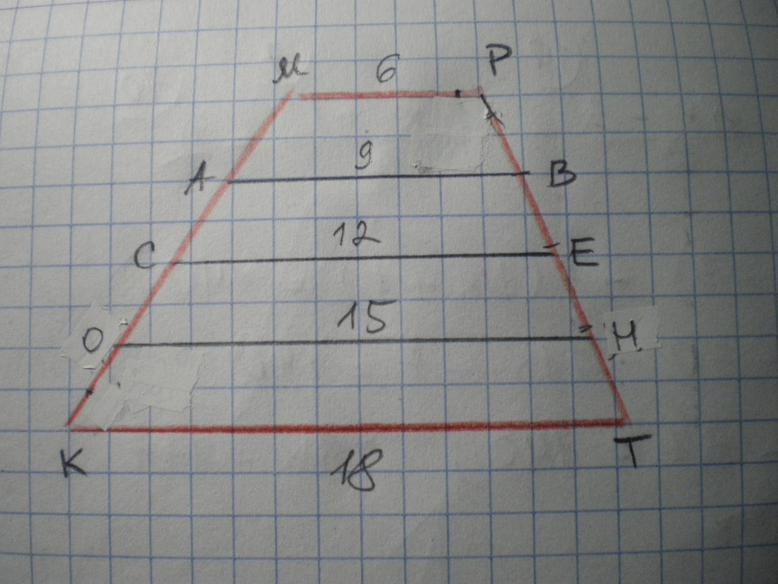 Дано: КМРТ - трапеция, АВ║СЕ║ОН║КТ; РВ=ВЕ=ЕН=НТ; МР=6 м; КТ=18 м. Найти АВ, СЕ, ОН.