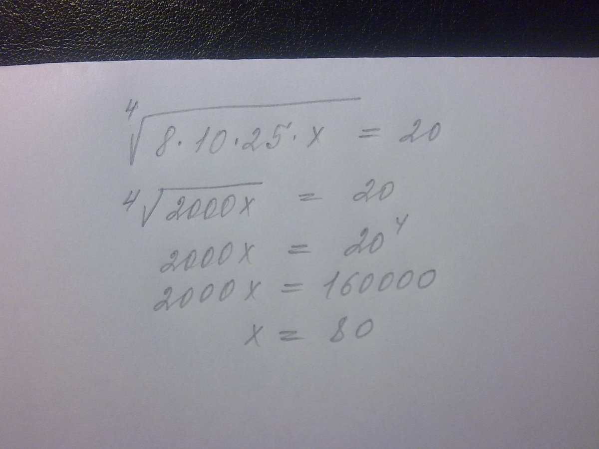 среднее геометрическое четырех положительных чисел равно 20.три из этих чисел соответственно равны 8,10 и 25.найдите четвертое число