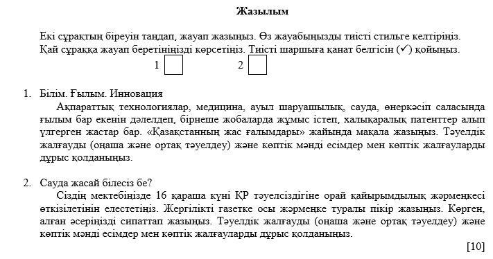 Екі сұрақтың біреуін таңдап, жауап жазыңыз. Өз жауабыңызды тиісті стильге келтіріңіз. Қай сұраққа жауап беретініңізді көрсетіңіз. Тиісті шаршыға қанат белгісін () қойыңыз. 1 2 1. Білім. Ғылым. Инновация Ақпараттық технологиялар, медицина, ауыл шаруашылық, сауда, өнеркәсіп саласында ғылым бар екенін дәлелдеп, бірнеше жобаларда жұмыс істеп, халықаралық патенттер алып үлгерген жастар бар. «Қазақстанның жас ғалымдары» жайында мақала жазыңыз. Тәуелдік жалғауды (оңаша және ортақ тәуелдеу) және көптік мәнді есімдер мен көптік жалғауларды дұрыс қолданыңыз. 2. Сауда жасай білесіз бе? Сіздің мектебіңізде 16 қараша күні ҚР тәуелсіздігіне орай қайырымдылық жәрмеңкесі өткізілетінін елестетіңіз. Жергілікті газетке осы жәрмеңке туралы пікір жазыңыз. Көрген, алған әсеріңізді сипаттап жазыңыз. Тәуелдік жалғауды (оңаша және ортақ тәуелдеу) және көптік мәнді есімдер мен көптік жалғауларды дұрыс қолданыңыз.