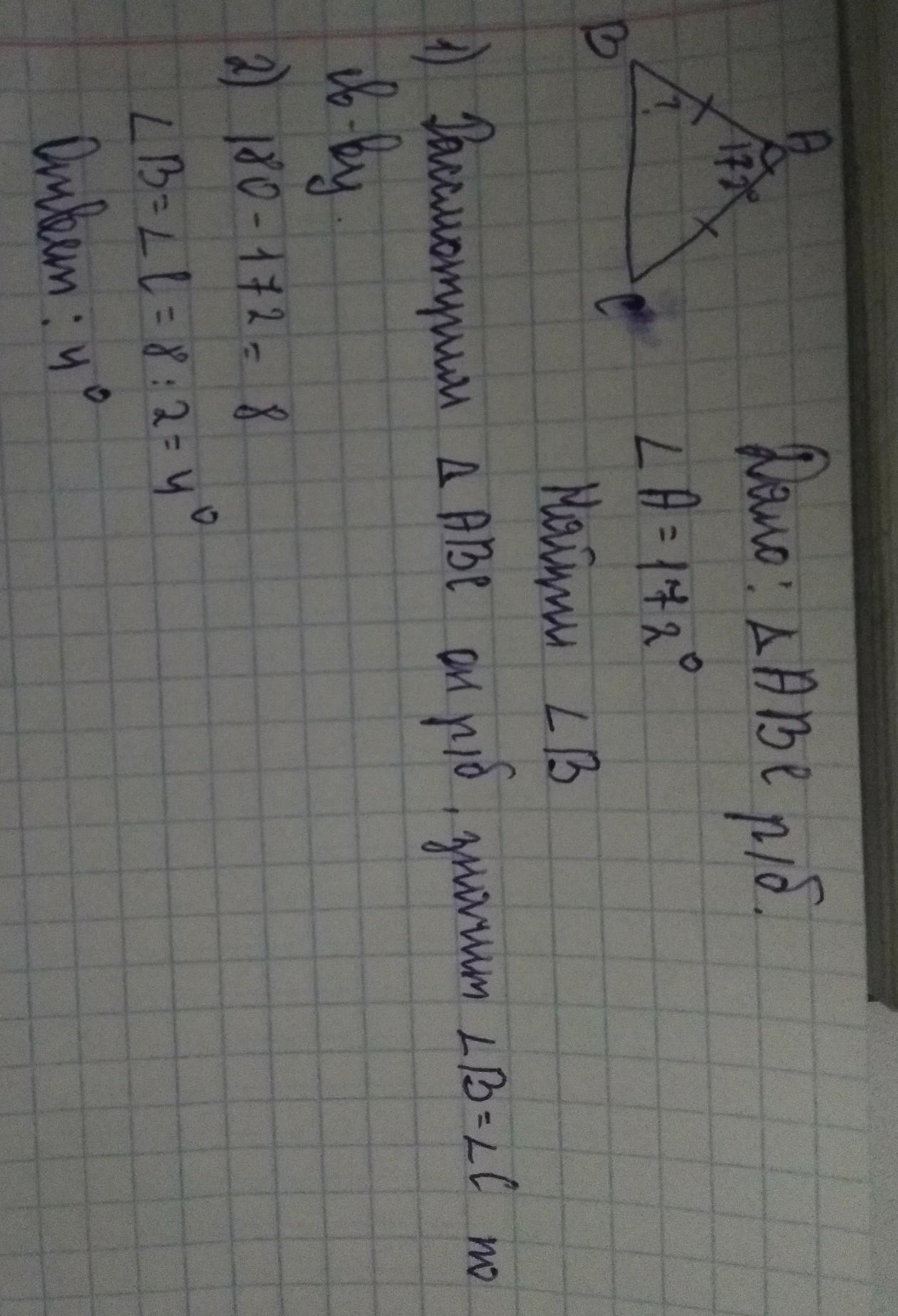 Объяснение: У равнобедренного треугольника углы при основание равны (угол В = углу С), сумма же всех углов треугольника равна 180 градусам, отсюда следует, что угол В равен (180-172):2=4
