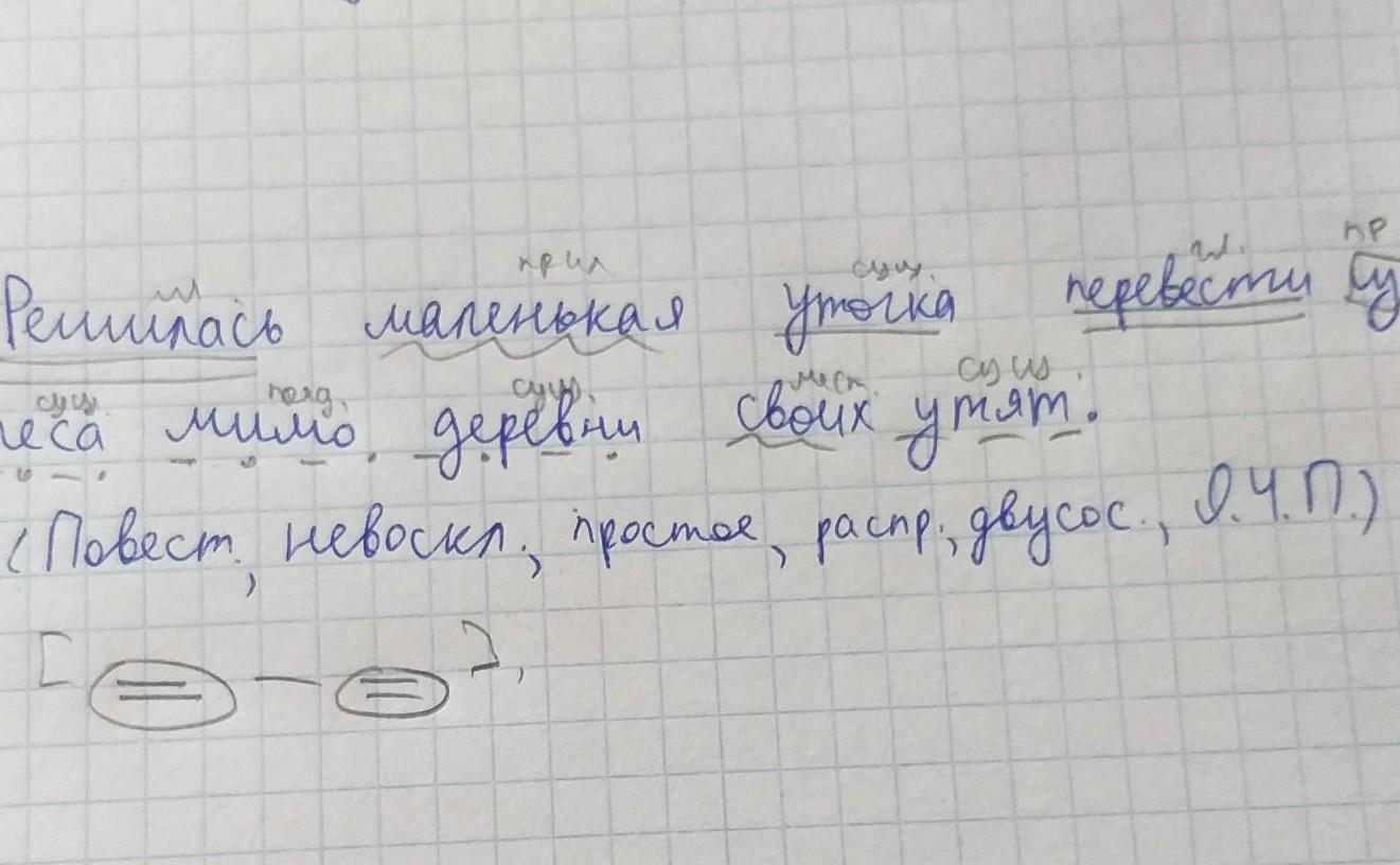 Решилась-сказуемое,маленькая-прилагательное,уточка-подлежащее,перевести-сказуемое,из-предлог,леса-деепричастие,мимо-предлог,деревни-деепричастие,своих-местоимение,утят-причастие.