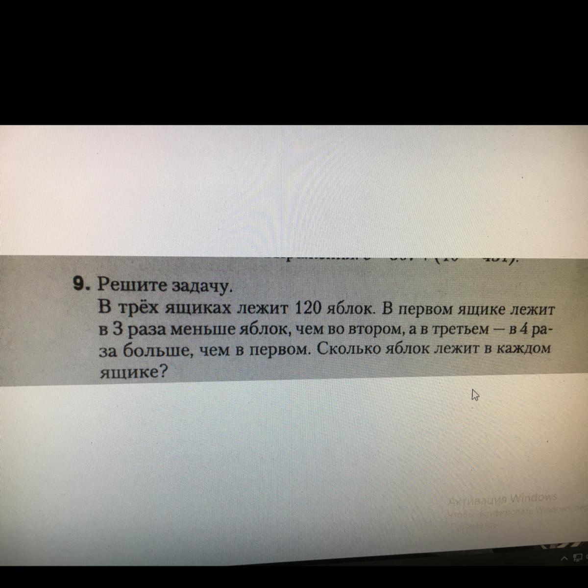 Т.к. в первом ящике яблок меньше всего пусть там будет 1 часть всех яблок. 1 * 3 = 3 (части) - во втором ящике 1 * 4 = 4 (части) - в третьем ящике. ... А это яблоки в 1 ящике. 15 * 3 = 45 (ябл.) - число яблок во втором ящике. (там их 3 части) 15 * 4 = 60 (ябл.) - число яблок в третьем ящике.(4 части) Ответ: 15 в первом, 25 во втором, 60 в третьем. Проверка: 15 + 45 + 60 = 120 120=120. Удачи)))