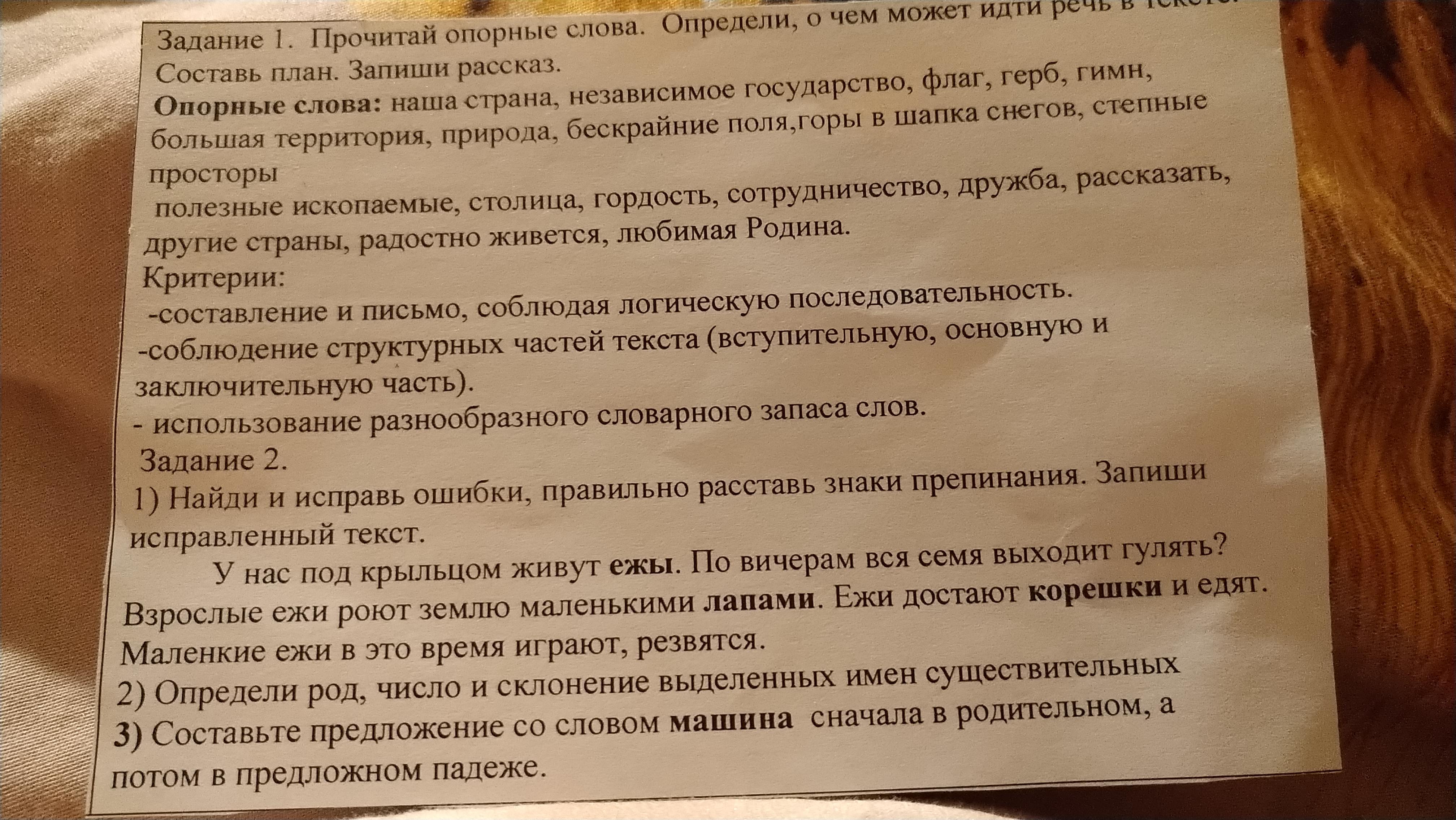 Ответ:1) Мы живём в независимой стране.Наша страна имеет флаг, состоящий из 3-ёх цветов, герб, гимн.У нас большая территория, бескрайние поля, горы.Мы имеем огромное количество ископаемых. У каждой страны есть своя столица.Я по-настоящему рад жить в этой дружелюбной стране.