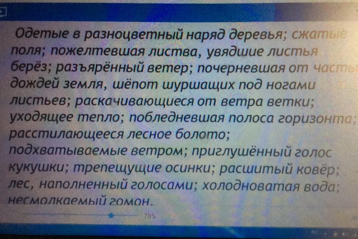Наступила осень.Пожелтевшая листва падает с деревьев на землю.Слышен шёпот шуршащих под ногами листьев.Одетые в разноцветный наряд деревья стали очень красивы.А вот и сжатые поля и его пожелтевшая трава.А в лесу как обычно спокойно,только слышен приглушенный голос кукушки.Вот и ручеёк в нём,холодноватая вода.За ручейком поляна,только она такая почерневшая от частых дождей!Поднялся туман.Теперь лес стал более загадочным.Но продолжал быть красивым.Расстилающееся лесное болото стал жутким из-за тумана.И всё таки,осень очень красивое время года!