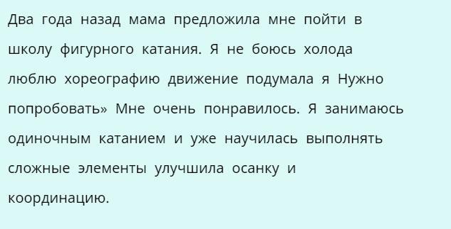 2 предложение: "Я не боюсь холода, люблю хореографию,движение" - подумала я. "Нужно попробовать".Мне очень понравилость.Катанием ,элементы,улучшила осанку и ......