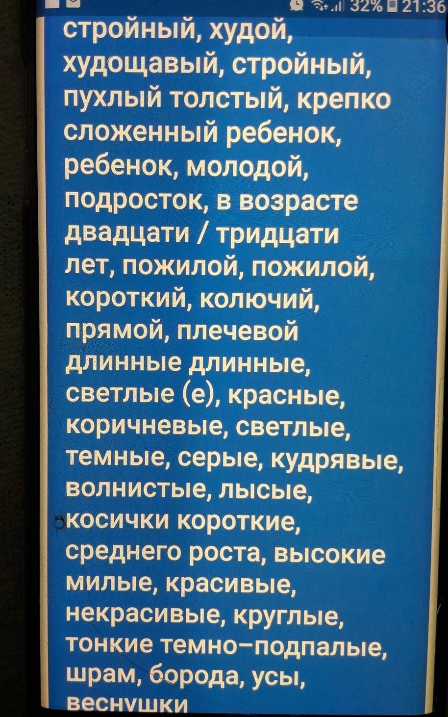 Стройный, тонкий, худой, атлетичный, полный, толстый, крупного телосложения.