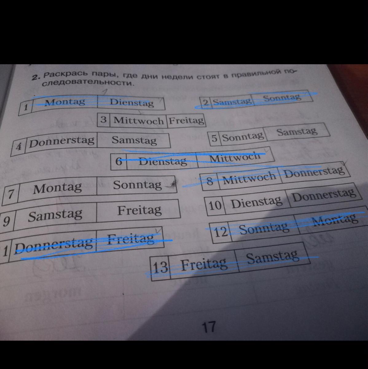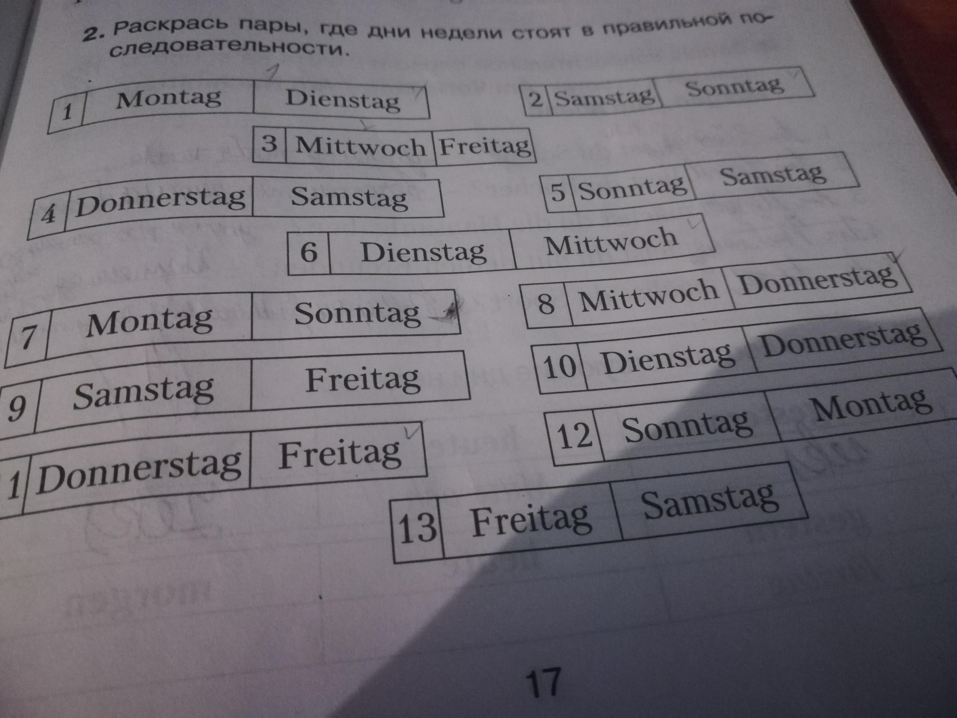 Раскрась пары, где дни недели стоят в правильной последовательности.1Montag Dienstag 2 Samstag Sonnag 3Mittwoch Freitag 4 Donnerstag Samstag 5Sonntag Samstag 6Dienstag Mittwoch 7 Montag Sonntag 8Mittwoch Donnerstag 9Samstag Freitag 10Dienstag Donnerstag 11Donnerstag Freitag 12Sonntag Montag 13Freitag Samstag