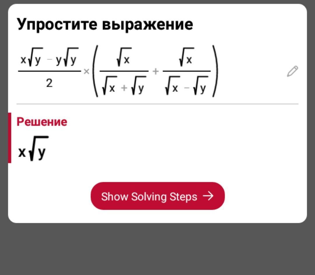 2)\frac{x\sqrt{y}-y\sqrt{y}}{2}*\frac{2x}{(\sqrt{x}+\sqrt{y})(\sqrt{x}-\sqrt{y})}=\frac{\sqrt{y}(x-y)}{2}*\frac{2x}{(\sqrt{x})^{2}-(\sqrt{y})^{2}}=\sqrt{y}(x-y)*\frac{x}{x-y}=x\sqrt{y}\\\\Otvet:\boxed{x\sqrt{y}}