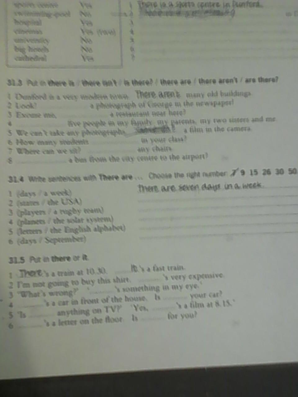 2)there is, 3)is there 4)there are 5) there isn't 6)are there 7)there aren't 8)is there