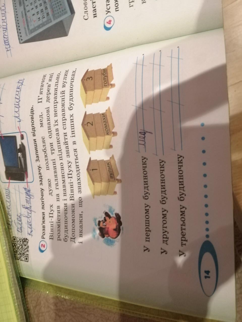 Вінні-пух дуже полюбляє мед. П'ятачок розмістив на галявині три однакові дерев'яні будиночки і навмисно підписав їх неправильно. Допоможи Вінні-пуху знайти справжній вулик і скажи що знаходиться в інших будиночках.