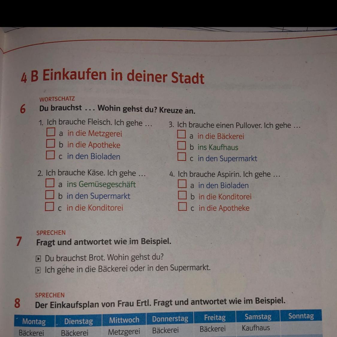 4. Ich brauche Aspirin. Ich gehe in die Apotheke.