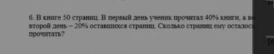 1)50/100*40=0.5*40=20 стр. прочитано в первый день