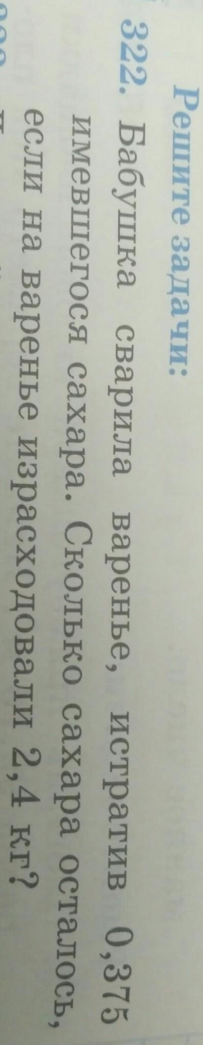 старушка израсходовала 0,375 всего сахара , а именно 2,4 кг, из этой скудной информации попытаемся выжать данные про весь сахарный запас старушки в прошлом, берём калькулятор и вводим 2,4/0,375=6,4 кг , теперь уже можно и остаток вычислить , 6,4-2,4=4 кило у бабуси ещё в запасе, можно решить ещё одним способом , 0,375 это у нас будет дробь