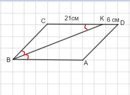 2. [6 баллов) Биссектриса параллелограмма ABCD делит его сторону СД на отрезки СК = 21см и КД