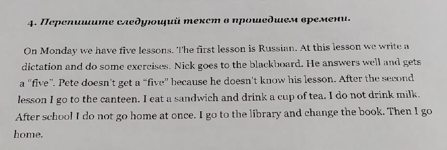 On Monday we had 5 lessons. The first lesson was Russian. At this lesson we wrote a dictation and some exercise. Nick went to the blackboard. He answered well and got a five. Pete didn’t get a five because he didn’t know his lesson. After the second lesson I went to the canteen. I ate a sandwich and drank a cup of tea. I didn’t drink milk. After school I didn’t go home at once. I went to the library and changed the book. Then I went home.
