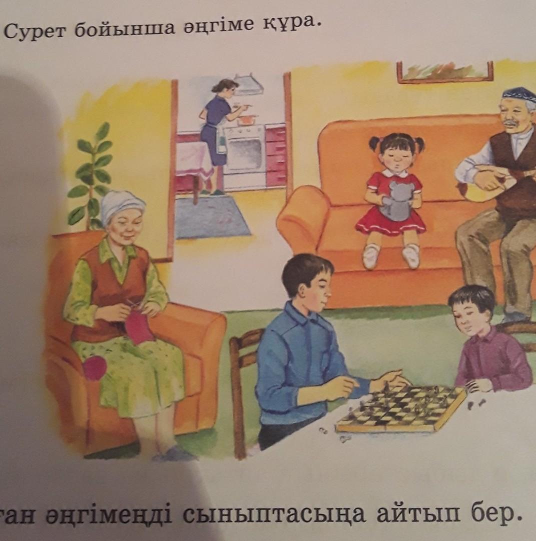 Отбасы түгел жиналды.Әкесі мен Асан шахмат ойнау да. Әжесі тоқыма тоқып отыр. Атасы домбыра тартуда. Айнұр қуыршақтары мен ойнау да. Анасы кешкі асты әзірлеу де.