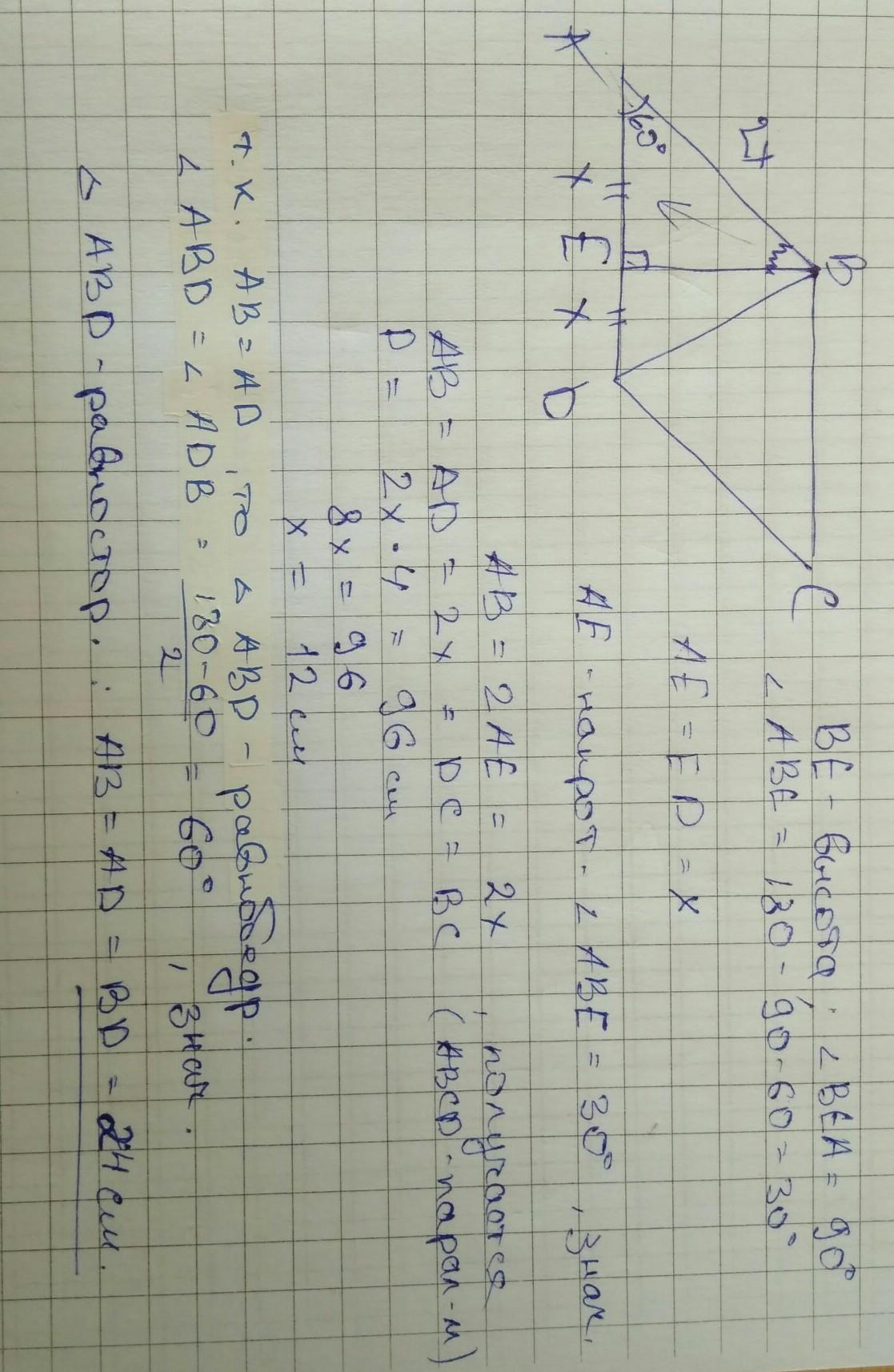 в параллелограме АВСД угол А равен 60°. Высота ВЕ делит сторону АД на две равные части. Нийдите длину диагонали ВД, если периметр параллелограма равен 96 см