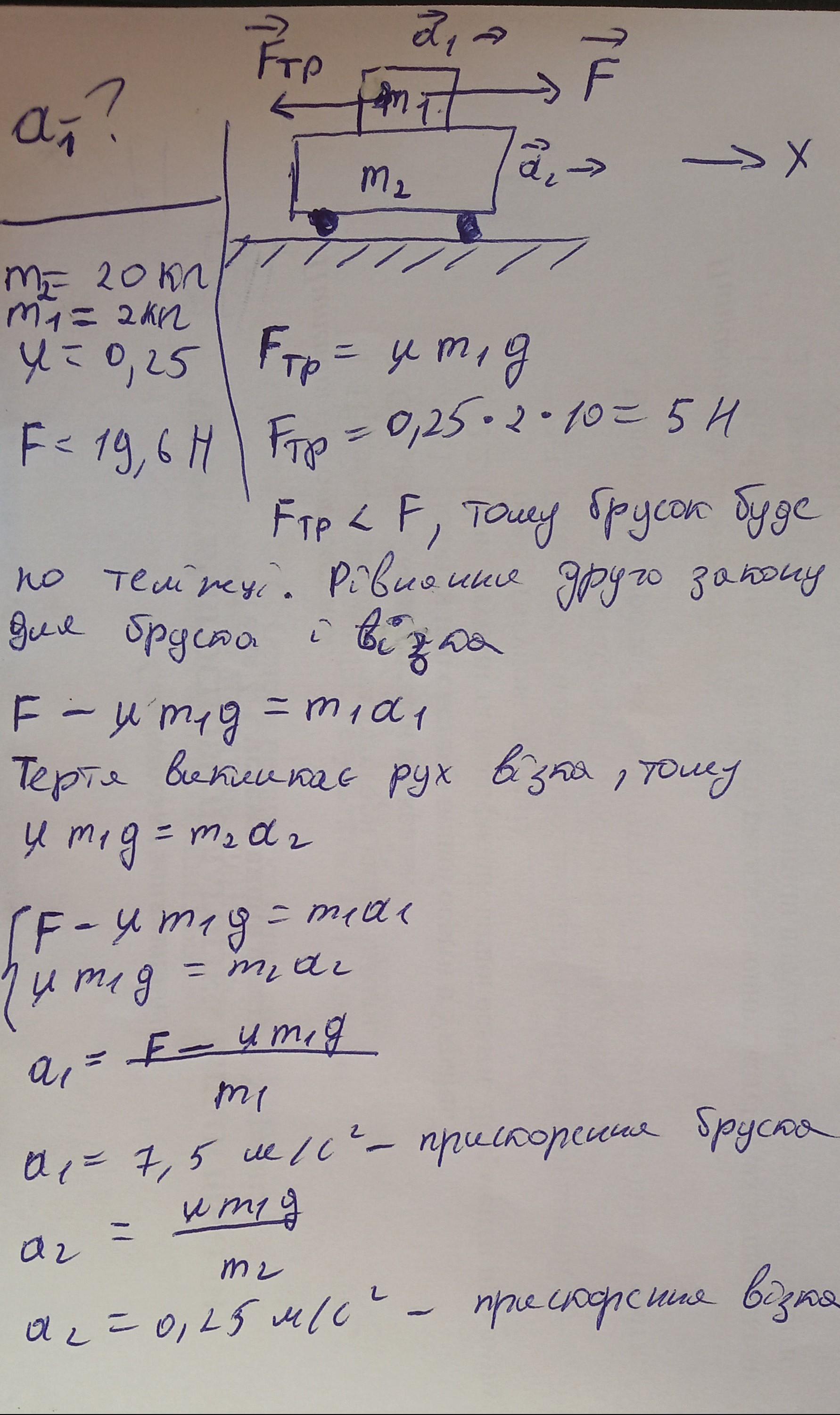 Тележка массой 20 кг может катиться без трения. На тележке лежит брусок массой 2 кг. Коэффициент трения между бруском и тележкой равен 0.25. к бруску приложена сила F= 19.6 Н. Найдите ускорение бруска.