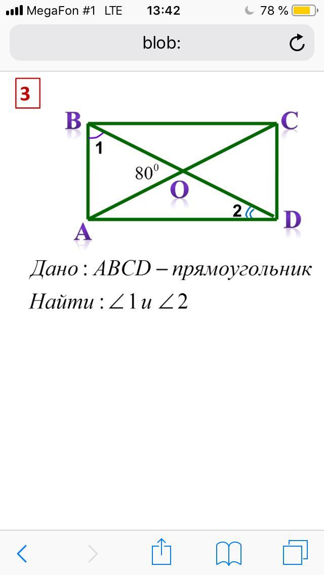 1) 360-80-80=200; 2)200/2=100; 3)100/2=50; 4)180-100=80; 5)80/2=40. Угол 1 50 градусов; угол 2 40 градусов.