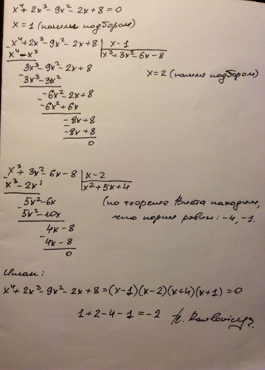 х(в четвертой степени)+2х(в третей степени)-9х(во второй степени)-2х+8=0