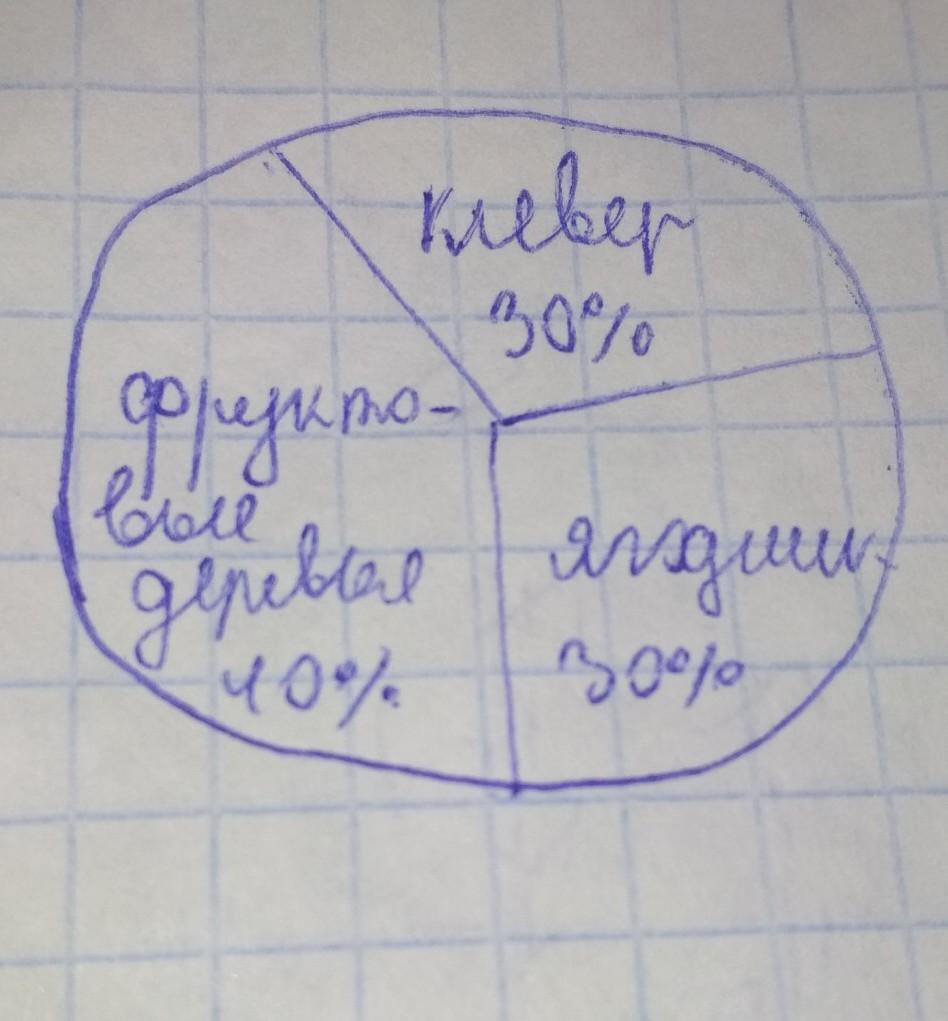 Площадь земельного участка 1080 м в квадрате . Две пятых этого участка занимают фруктовые деревья, ягодник -30%,а остальное засеяно клевером.Постройте круговую диаграмму распределения земельного участка