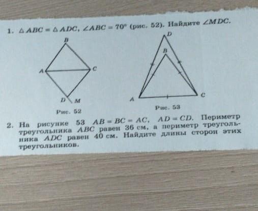 1.Угол ADC=угол ABC как равные углы равных треугольников. Угол MDC=180°-70°=110° - смежный угол при вершине треугольника(смежный угол + внутренний угол треугольника =180°).