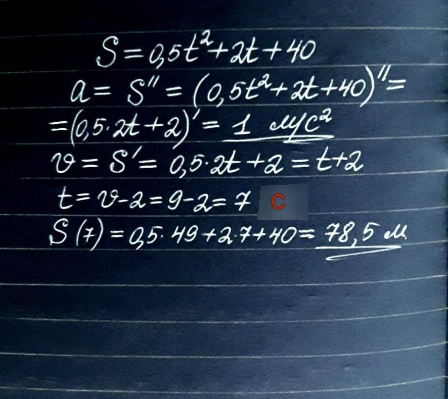 точка движется прямолинейно по закону s= 0.5t^2 +2t+40 .Определить ускорение и пройденный путь, когда величина скорости равна 9м/с