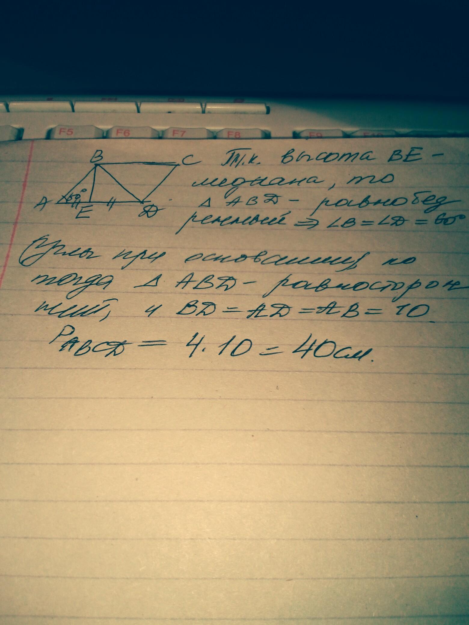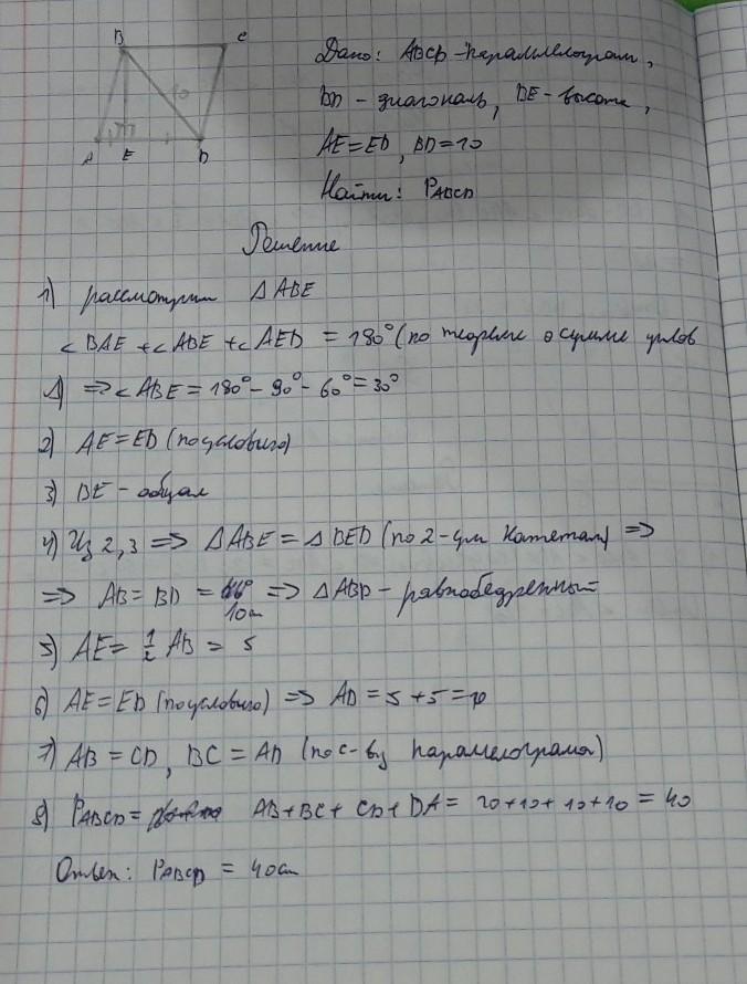 Срочно. В параллерограмме ABCD угол A=60 градусов. Высота BE делит сторону AD на две равные части.Длина диагонали BD=10см. Найдите периметр параллерограмма.