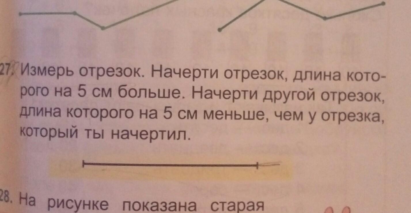 Измерь отрезок. Начерти отрезок, длина которого на 5 см больше. Начерти другой отрезок длина которого на 5 см меньше, чем у отрезка, который ты начиюертил