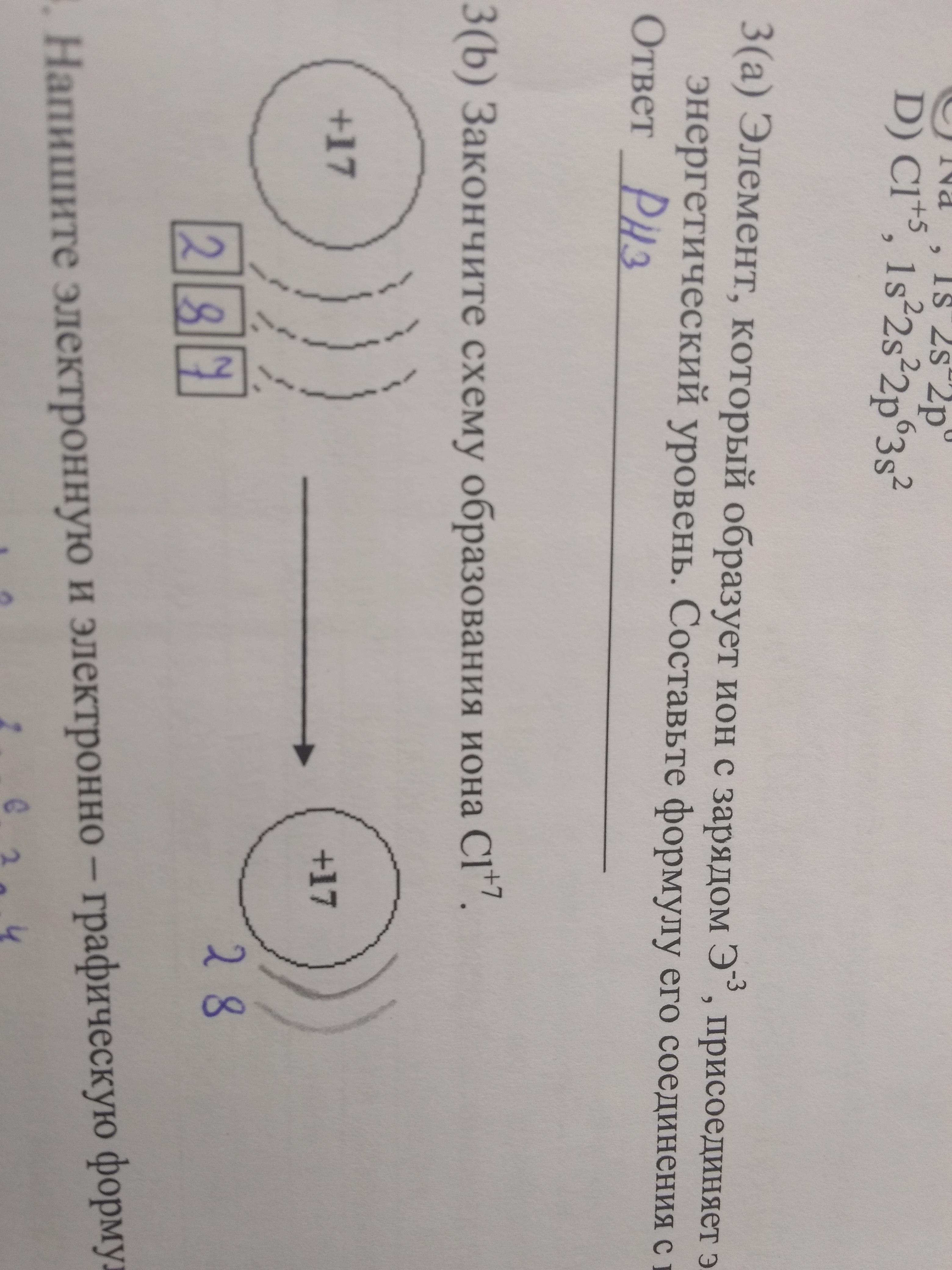 a) Элемент, который образует ион с зарядом Э-3, присоединяет электроны на третий энергетический уровень. Составьте формулу его соединения с водородом