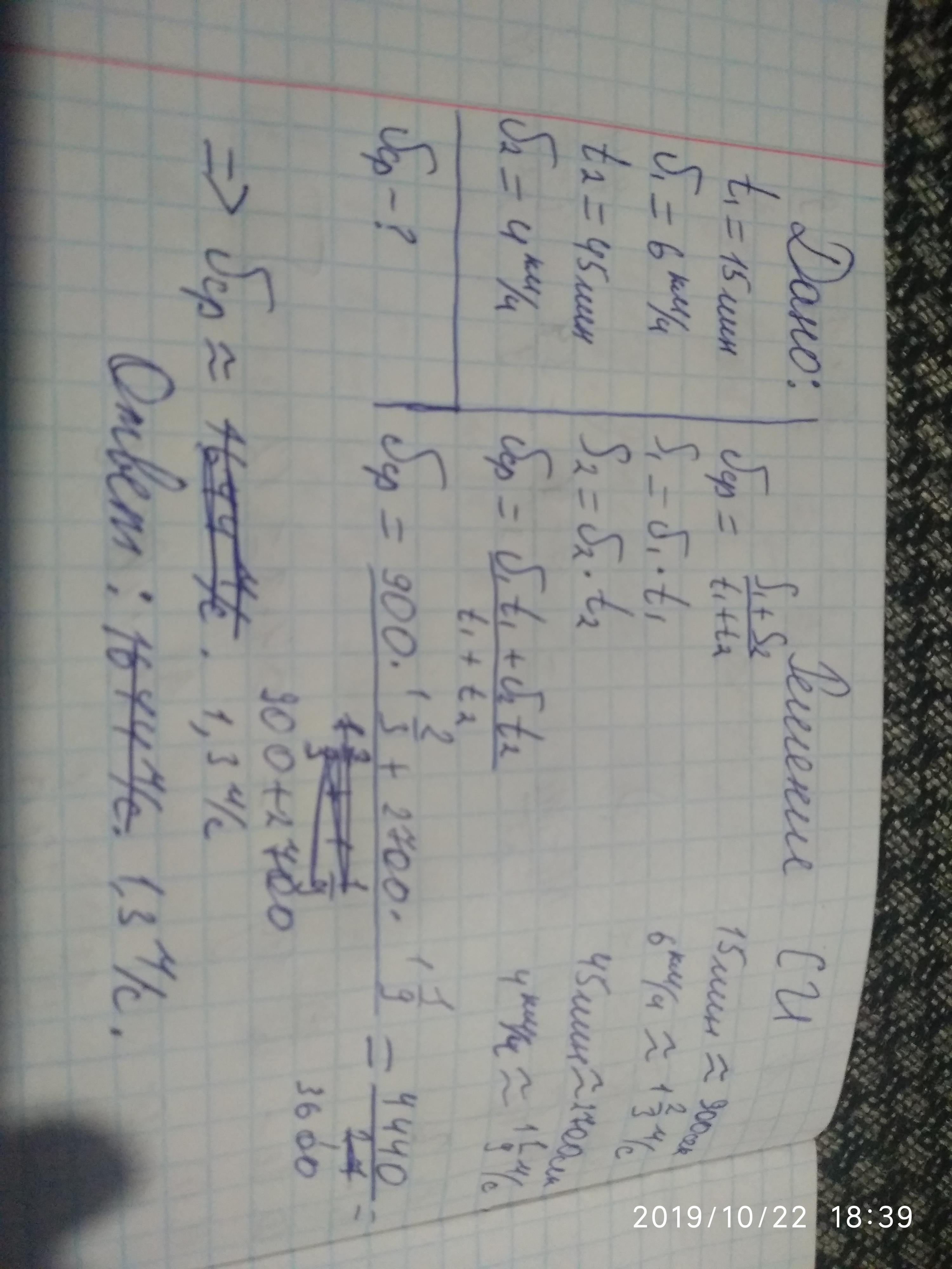 турист первые 15 мин шёл со скоростью 6 км/ч, а за тем 45 мин шёл со скоростью 4 км/ч Определите среднюю скорость туриста на всём пути