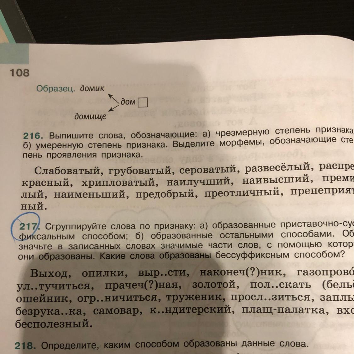 Сгруппируйте слова по признаку а) образованные приставочные суффиксальным способом; б) образованные остальными способами. Обозначьте в записанных словах значимые части слов, с помощью которых они образованы. Какие слова образованы бессуффиксным способом? 217 номер