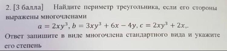 Найдите периметр треугольника, если его стороны выражены многочленами а=2xy^3, b=3xy^3+6x-4y,c=2xy^3+2x. ПОЖАЛУЙСТАСрочно надо Даю 50 баллов!!!