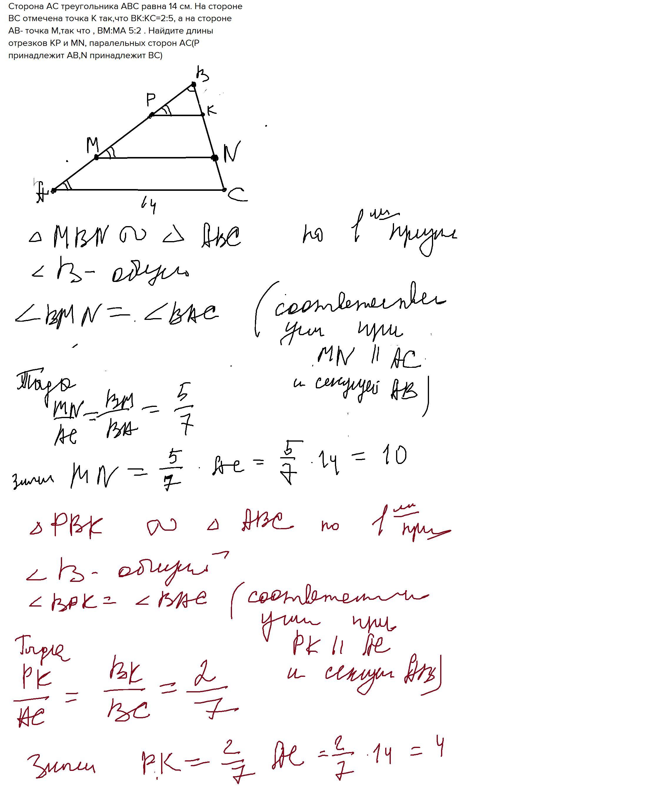 сторона АС треугольника АВС равна 14 см. На стороне ВС отмечена точка К так,что ВК:КС=2:5, а на стороне АВ- точка М,так что , ВМ:МА 5:2 . Найдите длины отрезков КР и MN, паралельных сторон АС(Р принадлежит АВ,N принадлежит ВС)