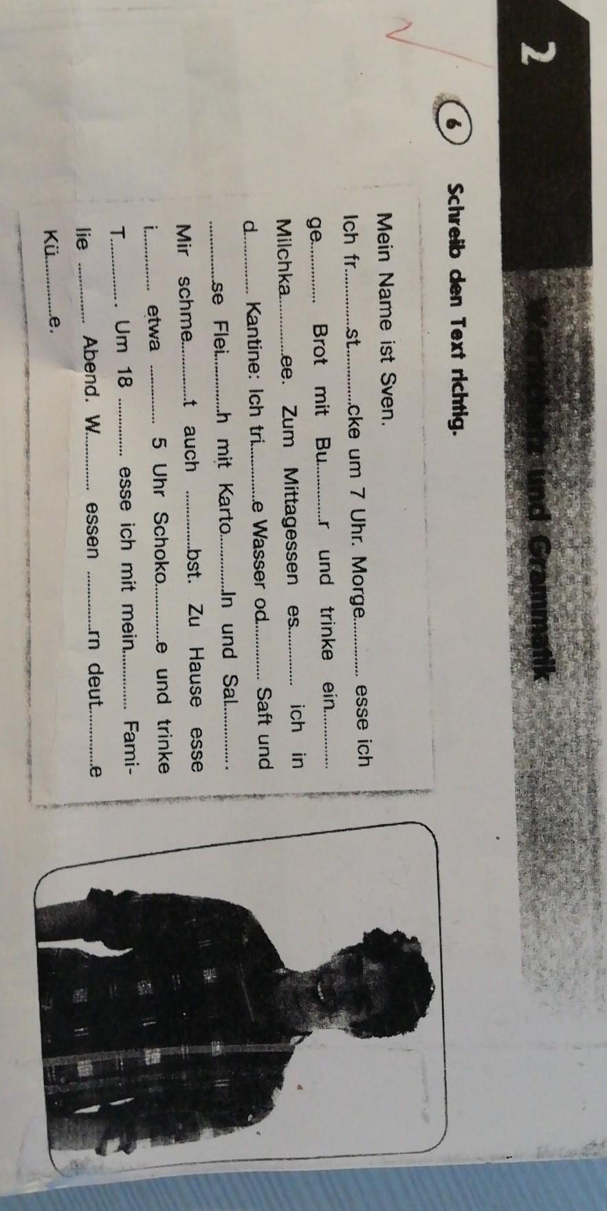 Morgens esse ich gewöhnlich Brot mit Butter und trinke eine Tasse (ein Glas) Milchkaffee. Zum Mittagessen esse ich in der Kantine: Ich trinke Wasser oder Saft und esse Fleisch mit Kartoffeln und Salat. Mir schmeckt auch Obst. Zu Hause esse ich etwa um fünf Uhr Schokolade und trinke Tee. Um 18 Uhr esse ich mit meiner Familie zu Abend. Wir essen gern deutsche Küche.