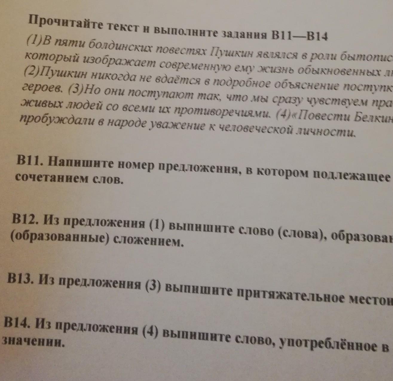 (1)В пяти болдинских повестях Пушкин являлся в роли бытописателя, который изображает современную ему жизнь обыкновенных людей. (2)Пушкин никогда не вдаётся в подробное объяснение поступков своих героев. (3)Но они поступают так, что мы сразу чувствуем правду, видим живых людей со всеми их противоречиями. (4)«Повести Белкина» пробуждали в народе уважение к человеческой личности.