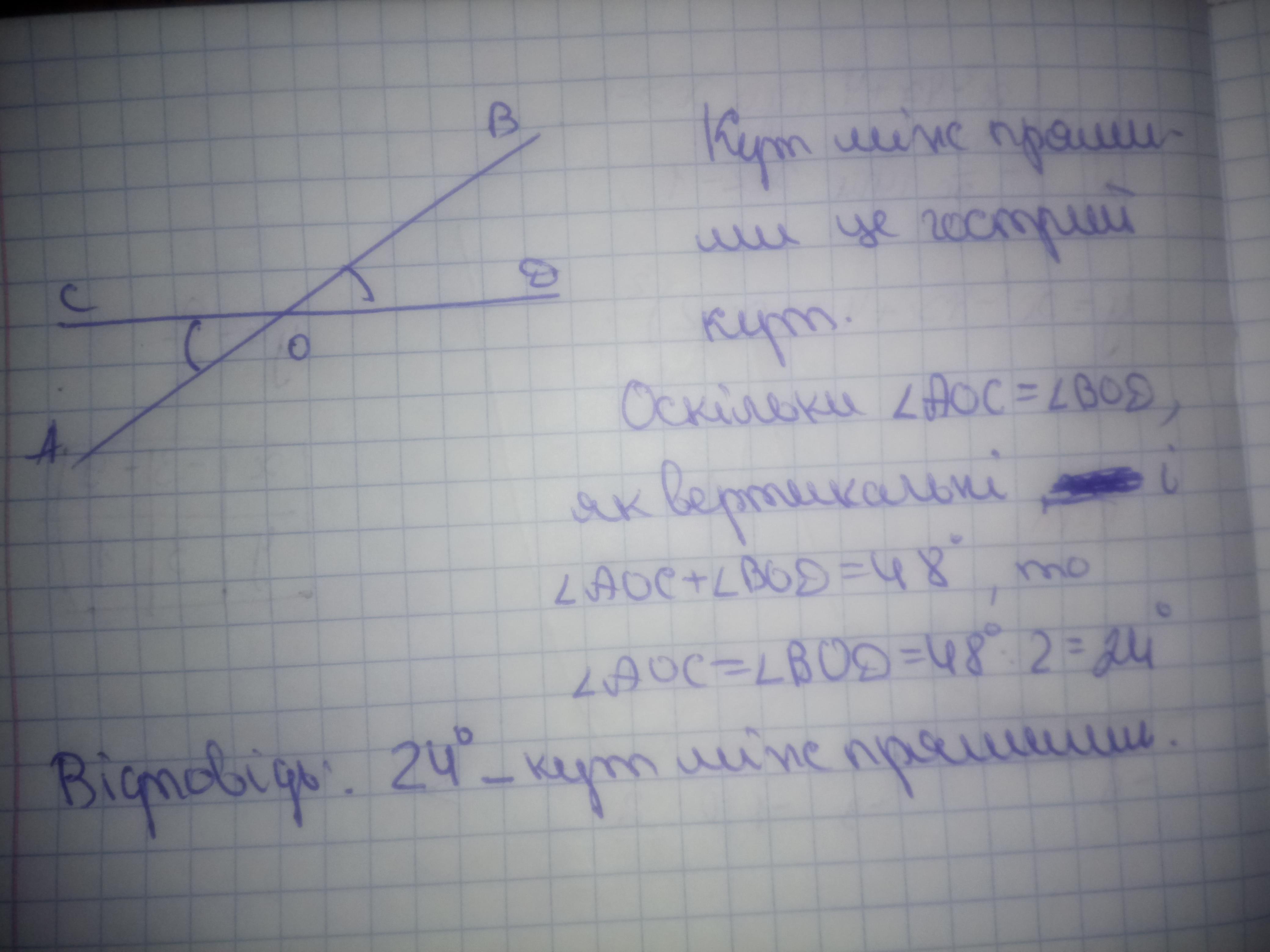 Знайдіть кут між прямими, що перетинаються, якщо сума двох кутів, що утворюються при їх перетині становить 48º.