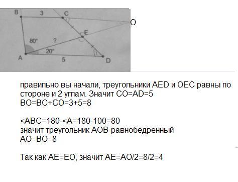 СТ ║АD и секущей СD). ВТ= ВС+СТ=3+5=8/см/, ВТ=АТ=8см, а т.к. АЕ=ТЕ, что следует из равенства треугольников СЕТ и DЕМ,