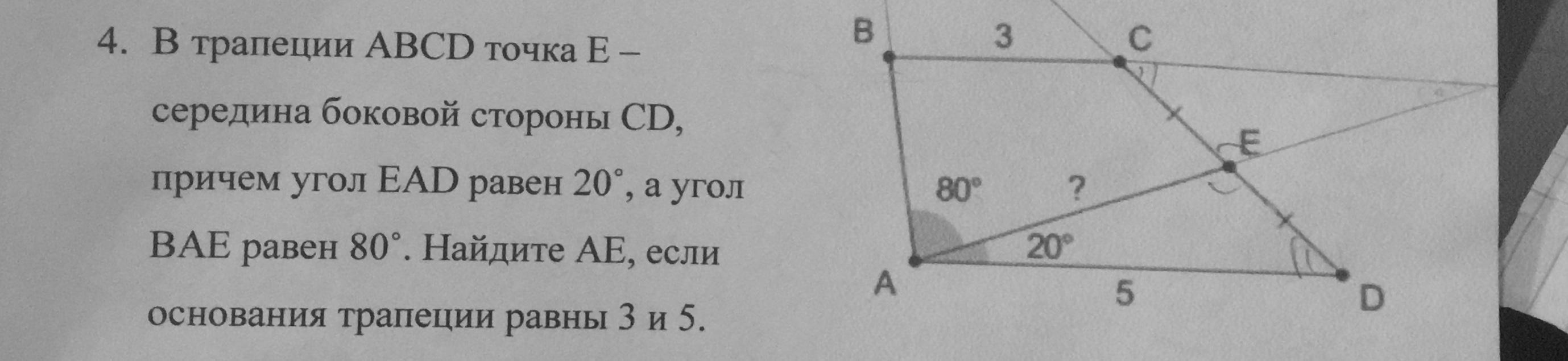 Если ВС продолжить до пересечения с АЕ в точке Т, получим равнобедренный треугольник АВТ. Значит, решение задачи сводится к нахождению АТ.